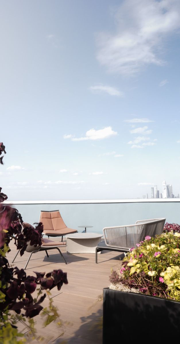 Protagonista è la terrazza panoramica al 43° piano del palazzo con vista mozzafiato su New York. L'arredo per esterno firmato Roda crea un ambiente accogliente e sofisticato con aree dedicate al relax e alla convivialità.